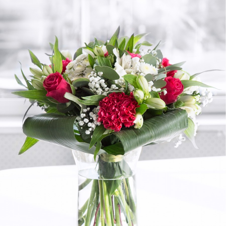 Immerse yourself in the captivating beauty of our unique bouquet, meticulously crafted to inspire creativity and elegance. This arrangement features sweet white chrysanthemums, airy gypsophila, sumptuous red roses, charming carnations, pristine white alstroemeria, and vibrant aspidistra leaves.